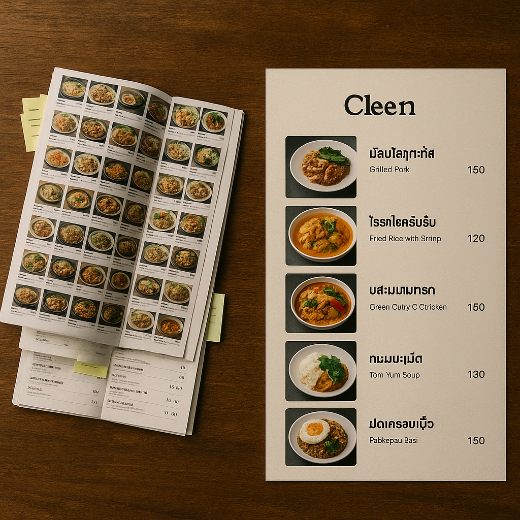 - เมนูรวม ≤ 60 รายการ (หรือ ≤ 12–20 ต่อหมวด)